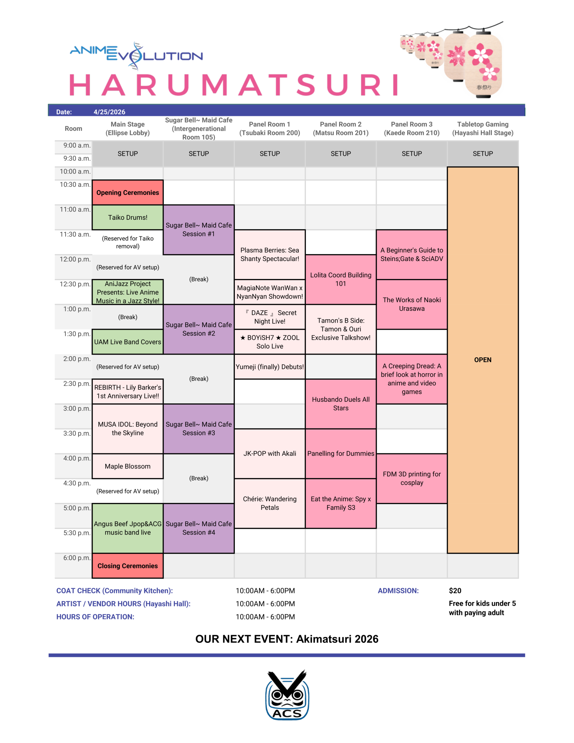 Harumatsuri is an annual 1-Day event held in the spring, serving as a light version of our annual 3-day convention in the summer. Harumatsuri is made of the Japanese words for spring (haru, 春) and festival (matsuri, 祭り) and is held with a special focus on Japanese arts and culture. In addition to our themed elements, Harumatsuri offers many of our traditional Anime Evolution summer events on a smaller scale including panels, video and AMV showings, gaming, artists alley, and vendors.